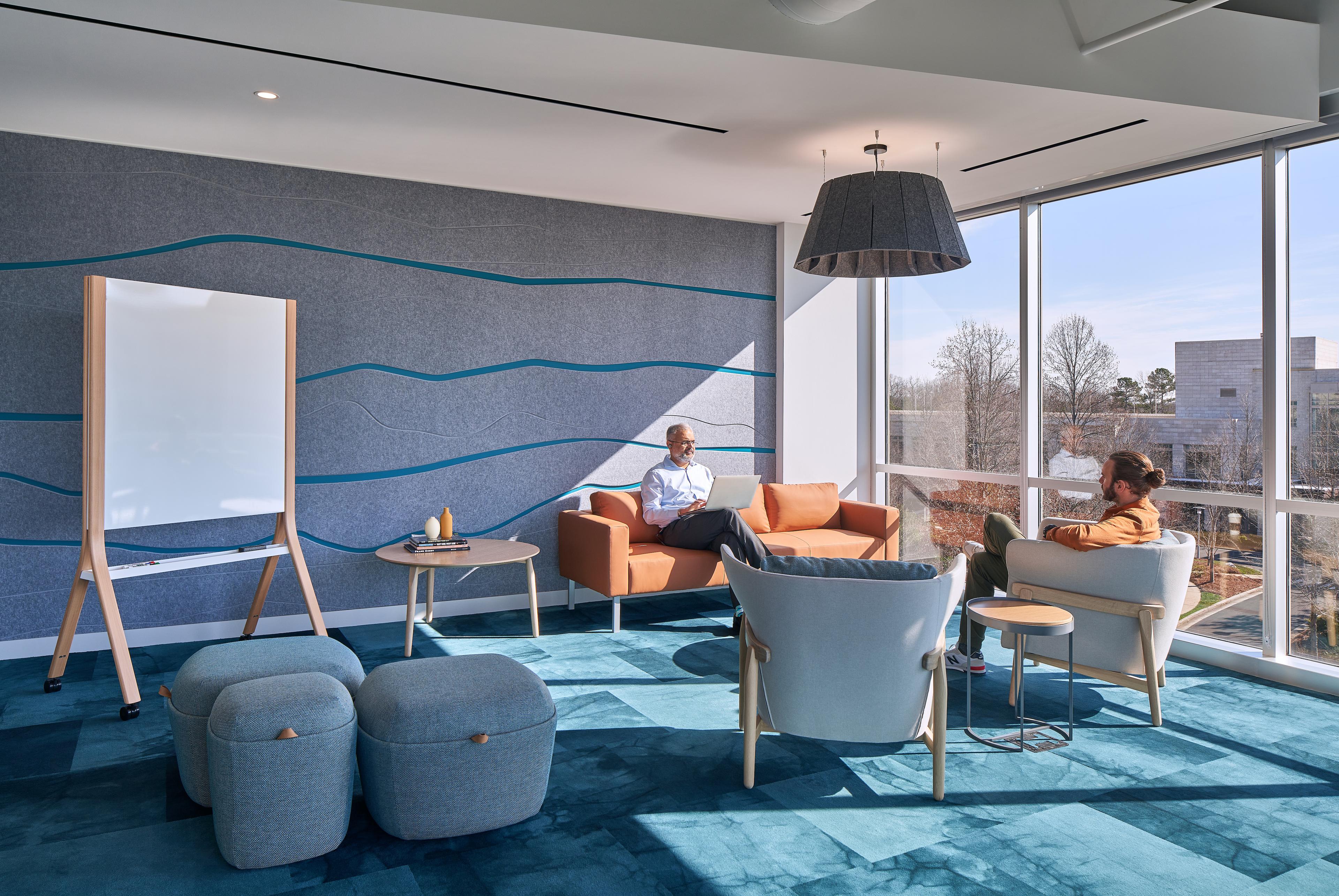 For the design of TIAA’s Charlotte campus, we collaborated with the IA Architects team to incorporate Turf into the open office areas. Turf products blend seamlessly into the space to maintain the office’s light and airy color palettes. Our team showcased Turf’s versatile custom capabilities through a custom-carved wave-mimicking wall panel in our Hues palette. Our acoustic ceiling baffles in Drop and Ridge sculpt an acoustic sanctuary in the office’s shared spaces, making an ideal environment for co-working.