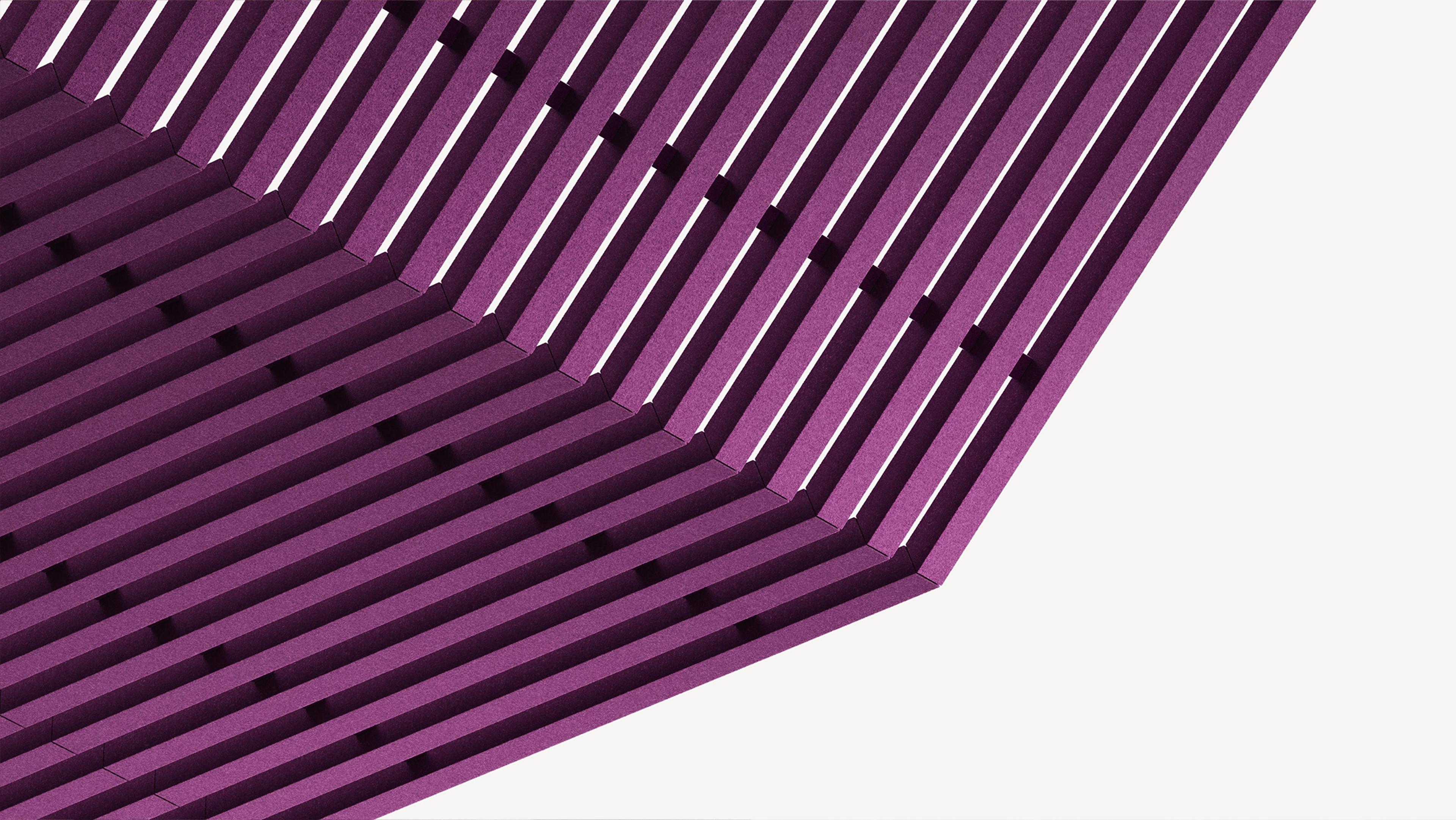 Airy ceiling scapes are made of Arbor baffles. Control opacity by choosing the number of baffles, and form a sound-absorbing canopy with this motif to make your own.