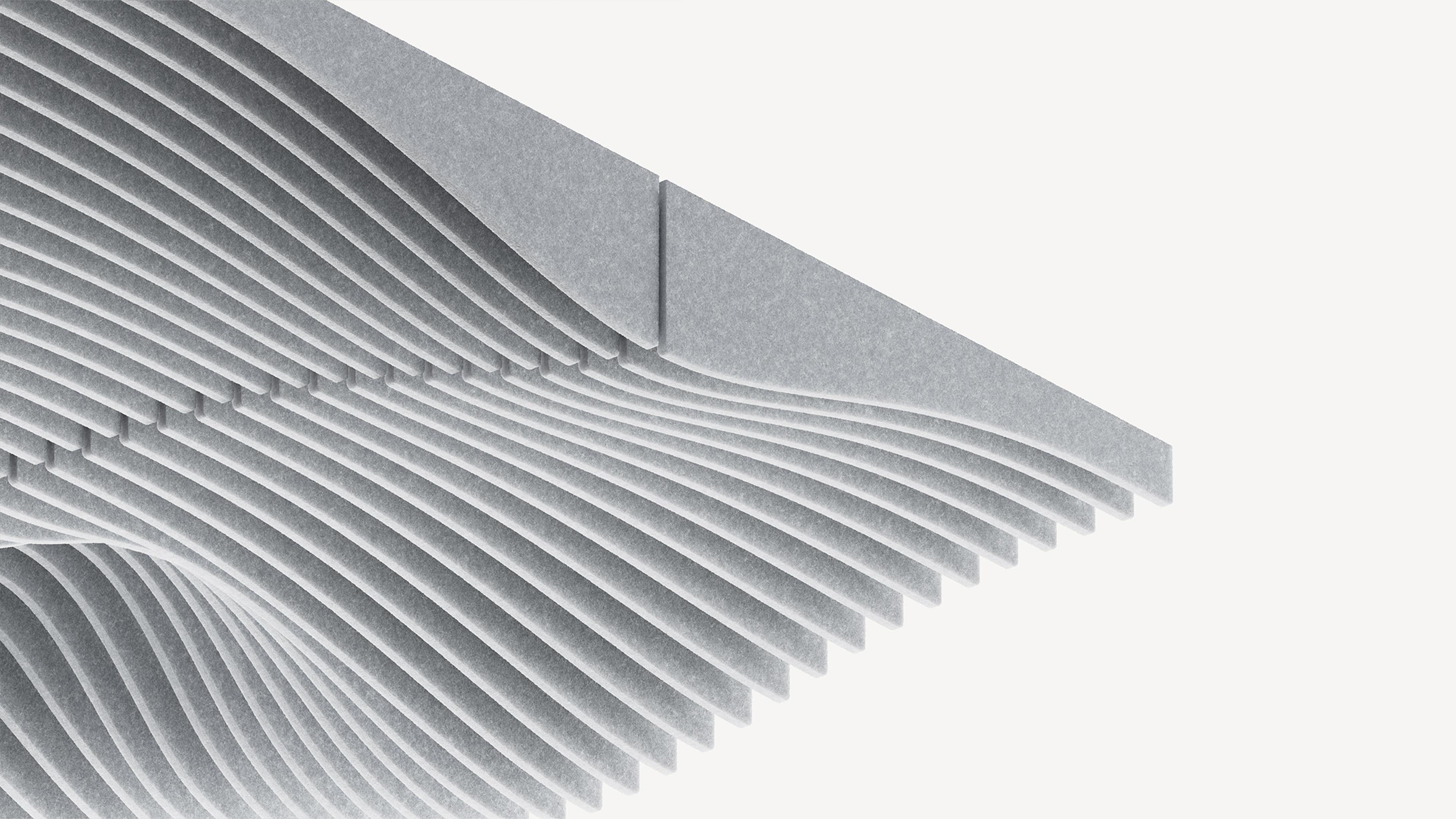 Surging surfaces, and silence, undulate overhead. Modular tiles are designed to be configured into flowing ceilingscapes, with profoundly customizable potential. Swell washes away acoustic detritus while sweeping you in.